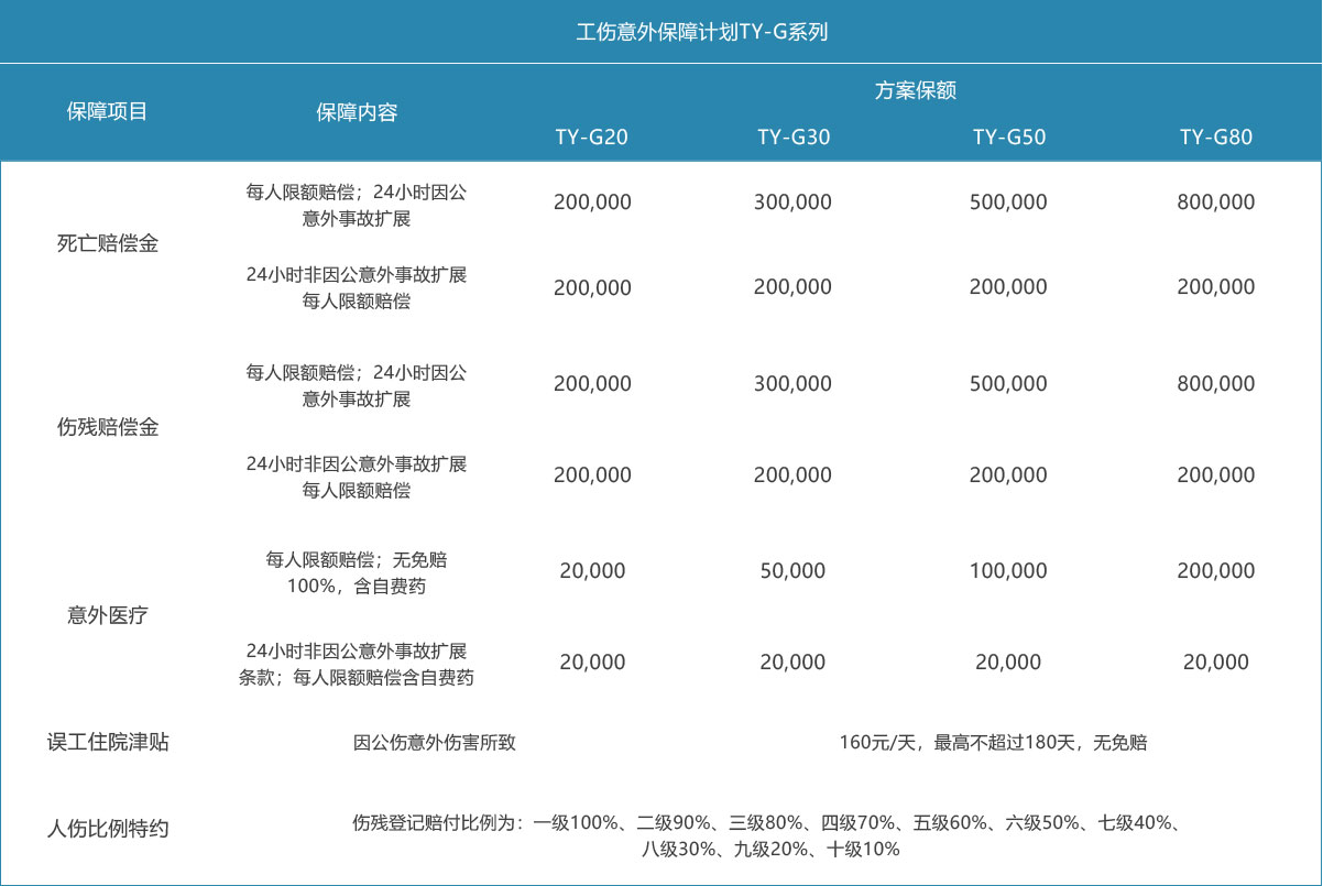 失劳动能力期间的住院津贴,保障可扩展非工作期间的意外伤害,保障人数越多越优惠,免除用工企业后顾之忧。
